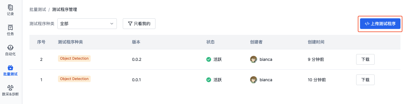 - 在项目左侧边栏,选择「批量测试」,点击按钮进入「测试程序管理」页面: