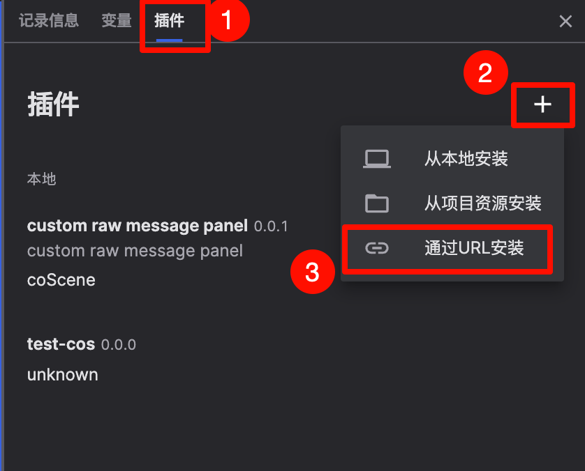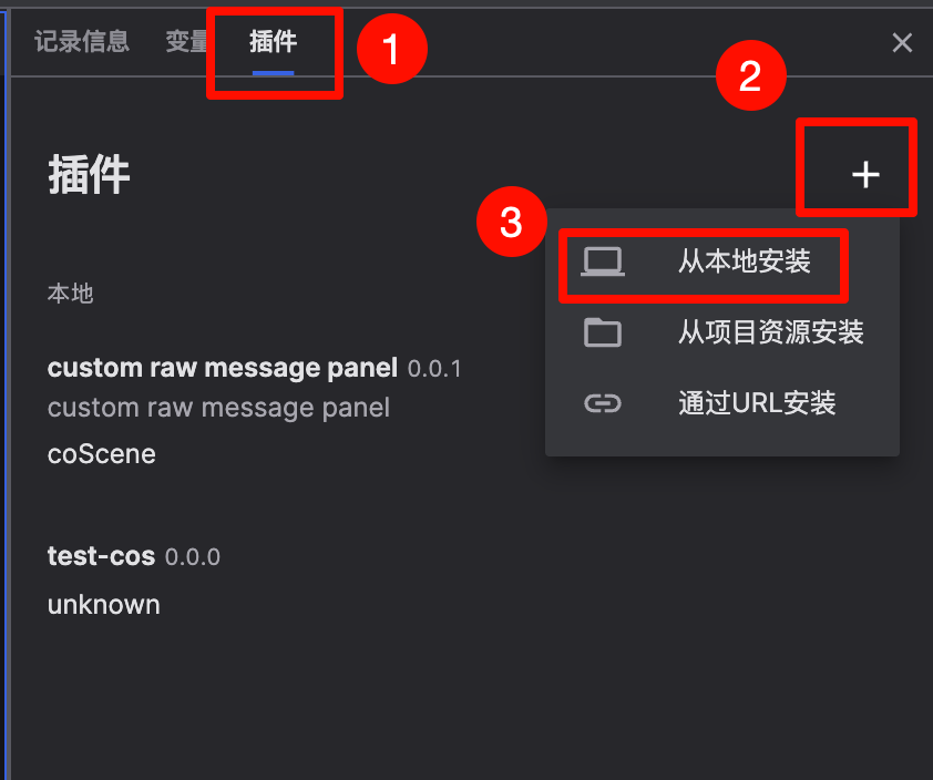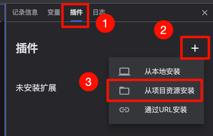 菜单安装:点击右侧插件面板中的加号图标,选择【从本地安装】,然后选择对应的本地扩展文件进行安装。